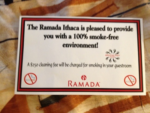 Thanks to NASCAR weekend, we were forced to pay $500 for the last two remaining rooms in Upstate New York…at the Ramada Inn. Thank God they are a 100% smoke-free environment. Except for the smell of smoke that permeates 100% of everything.